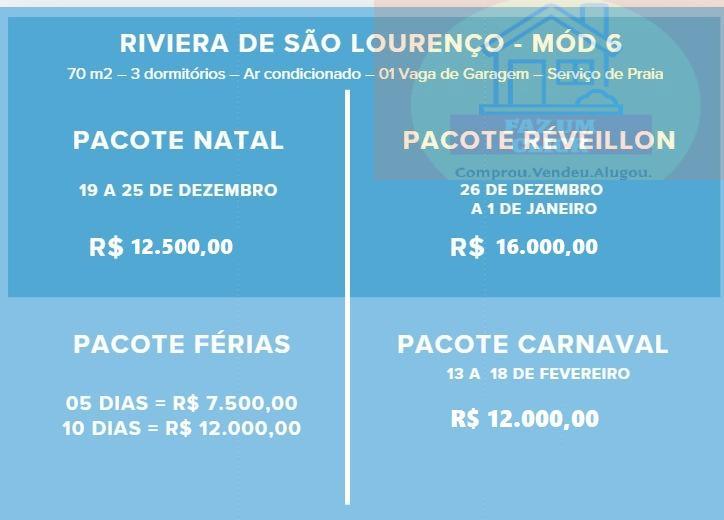 Aproveite dias inesquecíveis neste aconchegante duplex para temporada na Riviera de São Lourenço, Módulo 6. Totalmente mobiliado e equipado com airfryer, máquina de café expresso e convencional, adega, liquidificador, pratos e talheres. Com serviço de praia, e ar condicionado! Comporta até 6 pessoas com conforto. O prédio oferece piscina descoberta aquecida, sauna, salão de jogos e 1 vaga. Ideal para relaxar com estilo e praticidade, a poucos minutos da praia.